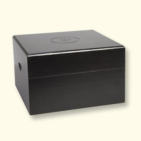 Het handgemaakte kistje voor de Rouwknoop is van zwart gebeitst elzenhout. Maten: (ongeveer) LxBxH=125x125x83mm. In het deksel is het parlAmore logo verzonken (blinddruk). | parlAmore©