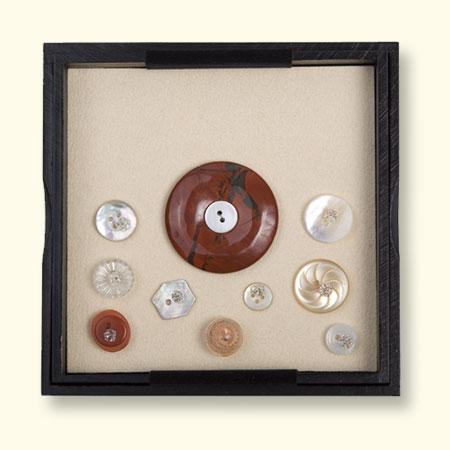 Jaspis Rouwknoop, in het kistje omringd door knoopjes van dierbaren. Deze zijn met kristallen spelden vastgezet. Maten: L x B = ongeveer 125x125mm