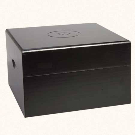 Het handgemaakte kistje voor de Rouwknoop is van zwart gebeitst elzenhout. Maten: ong. LxBxH=125x125x83mm. In het deksel is het parlAmore logo verzonken (blinddruk). | parlAmore©