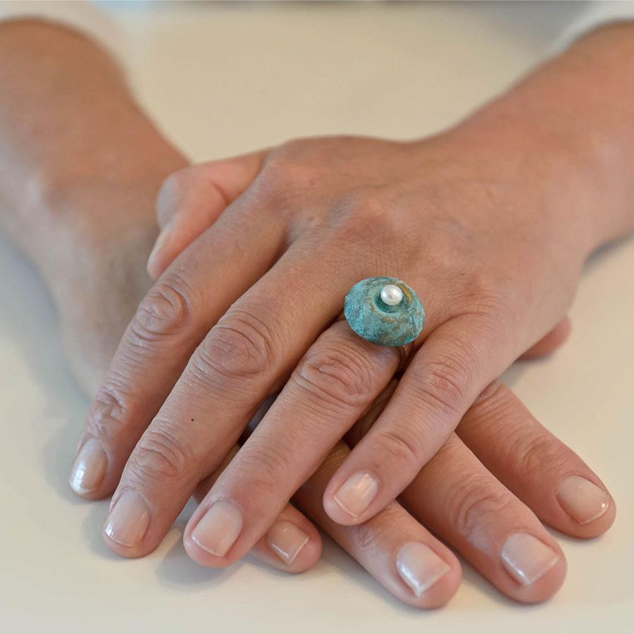 De As-Cabochon is van brons, zilver of gepatineerd brons. Bovenop zit een parel. De ring is van zilver of goud. Geleverd in een exclusief, handgemaakt kistje. | parlAmore©