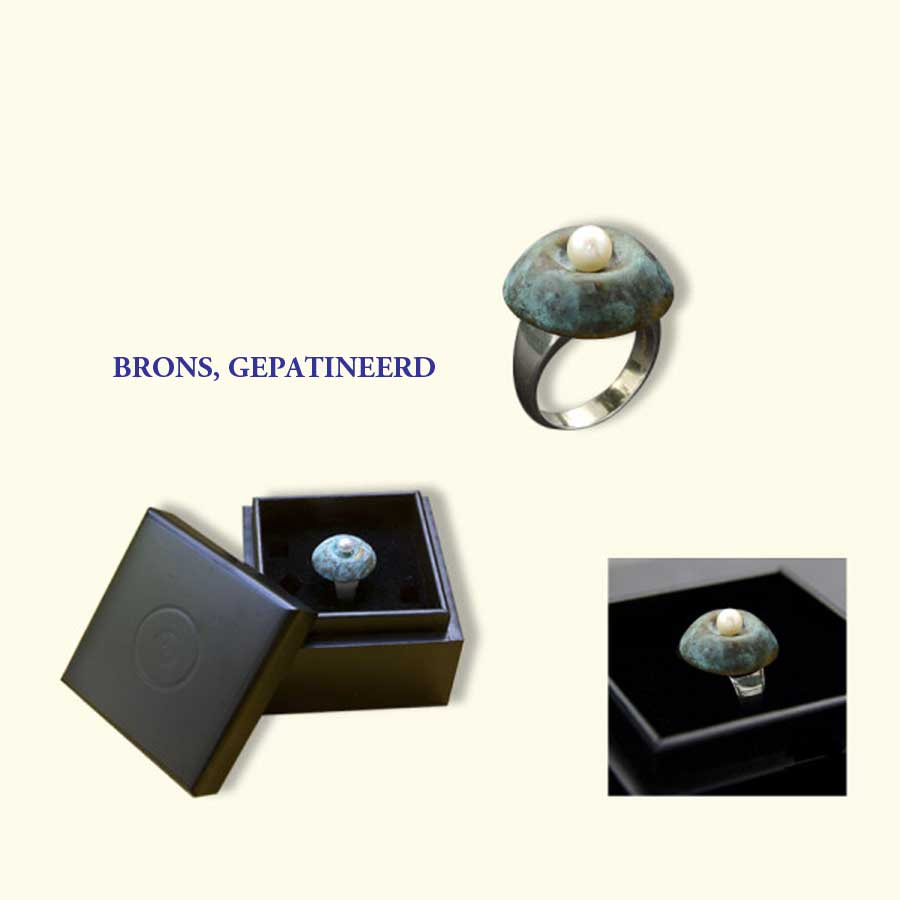 Een As-Cabochon van gepatineerd brons, afgewerkt met een parel, op een zilveren ring. Geschikt voor wat as, een beetje aarde of een haarlokje. In een exclusief kistje. | parlAmore©