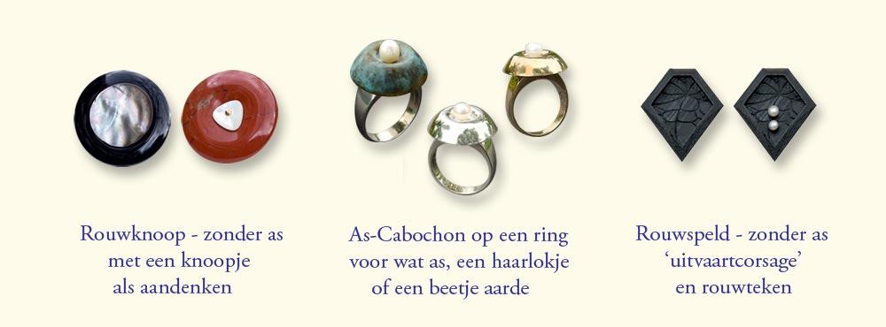 Assortiment rouwsieraden met en zonder as: Rouwknopen in onyx en jaspis, zilveren, bronzen en gepatineerde As-Cabochons op ringen, Rouwspelden met bladnerf en met parels | parlAmore©